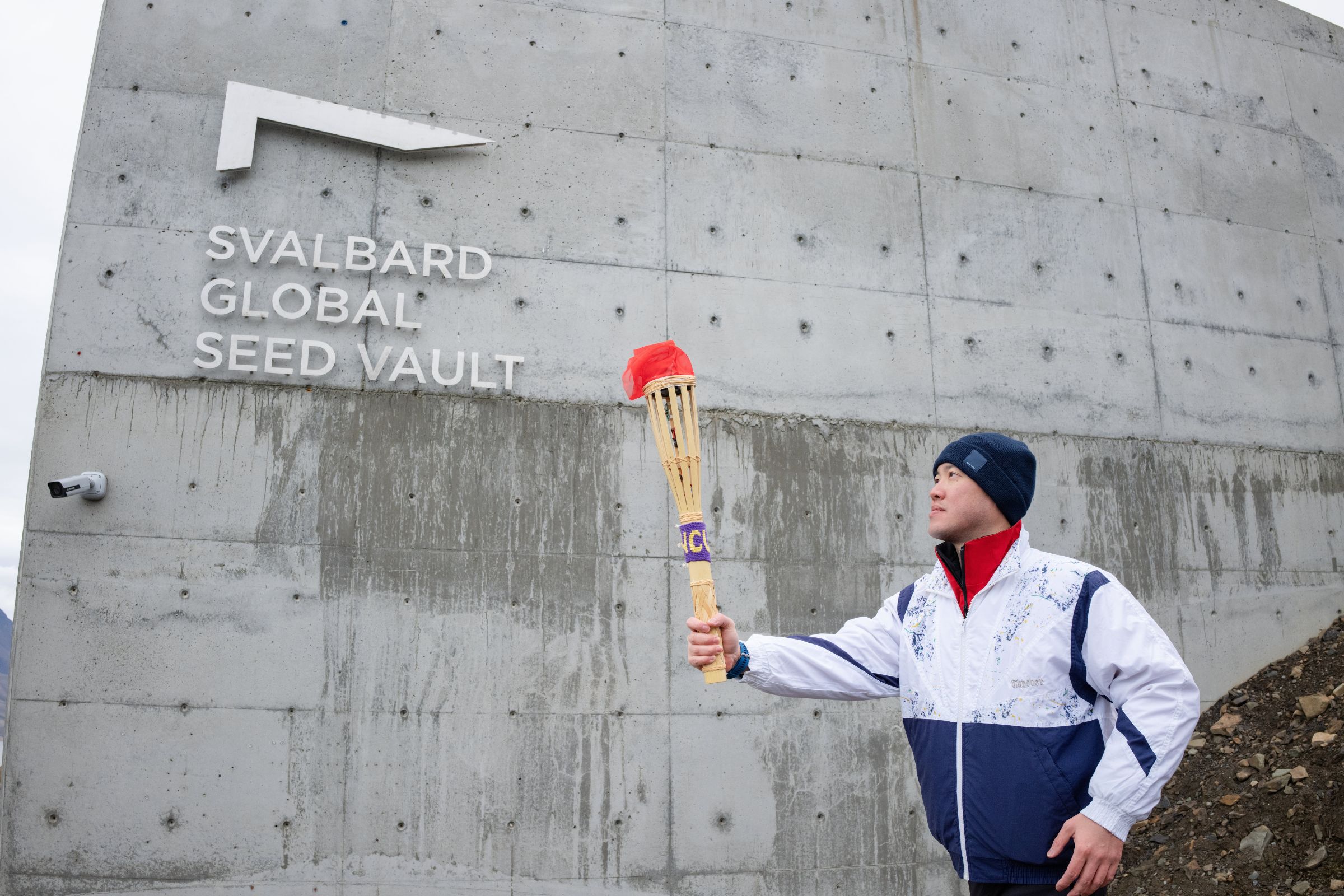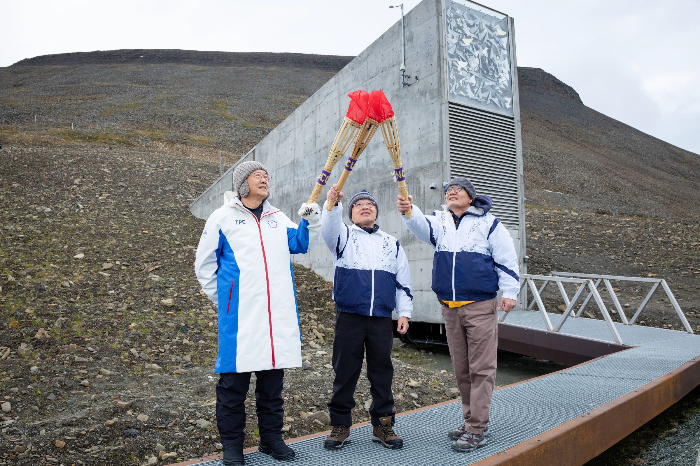 115年全大運史無前例地在北極引燃聖火,在全球種子庫(Seed vault)前,高舉台灣原住民工藝的聖火火炬,象徵生命起源與無限希望。115年全大運辦公室提供
